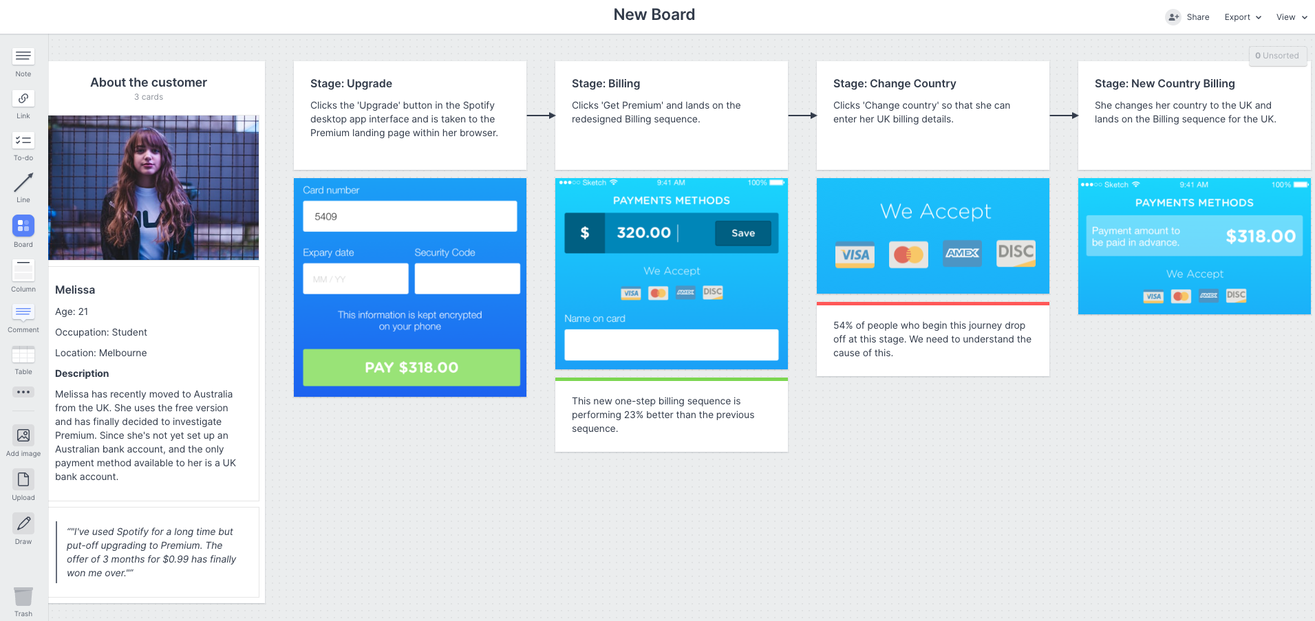 核心任務:找出一個你最適合的「顧客旅程地圖」工具,像是使用簡易拖拉式介面的 Milanote 就很適合,把所有盤點的資訊、接觸點與洞察,繪製成一張清晰的視覺化地圖。