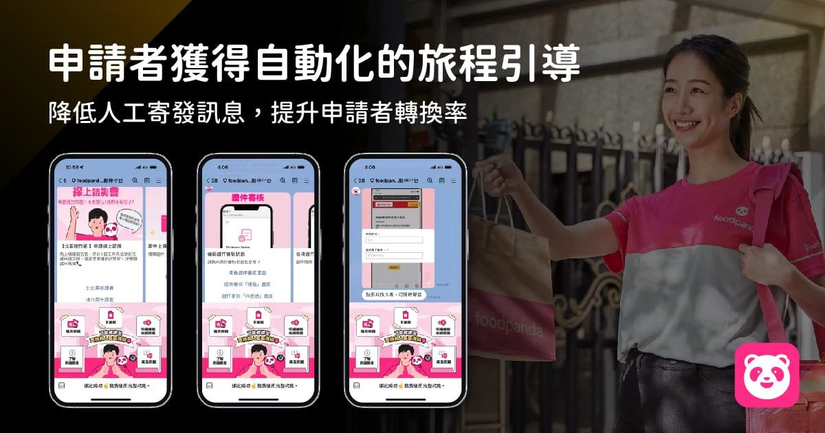foodpanda 透過 LINE 官方帳號,讓申請者透過 LINE 官方帳號獲得「個人申請連結」與「進度通知」,協助申請者於 2-3 天內成功開通並上線,讓申請者能更快速完成申請步驟。
