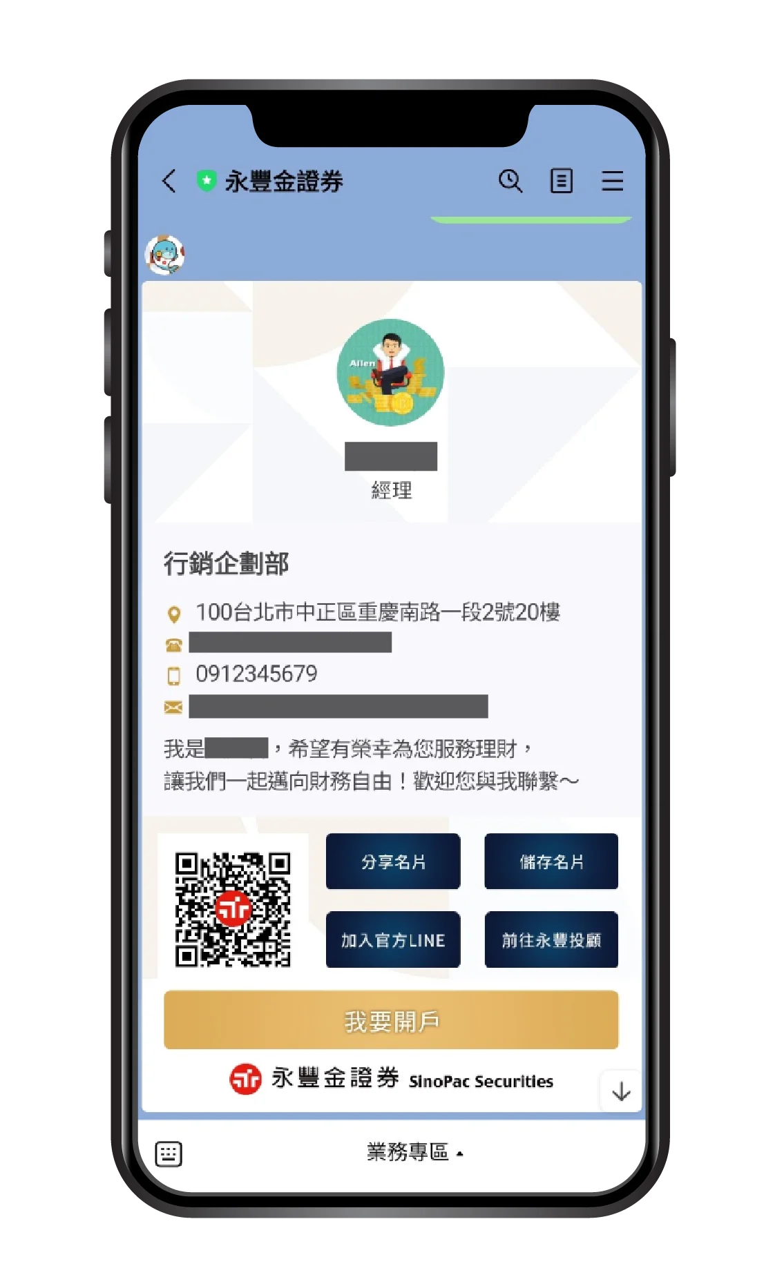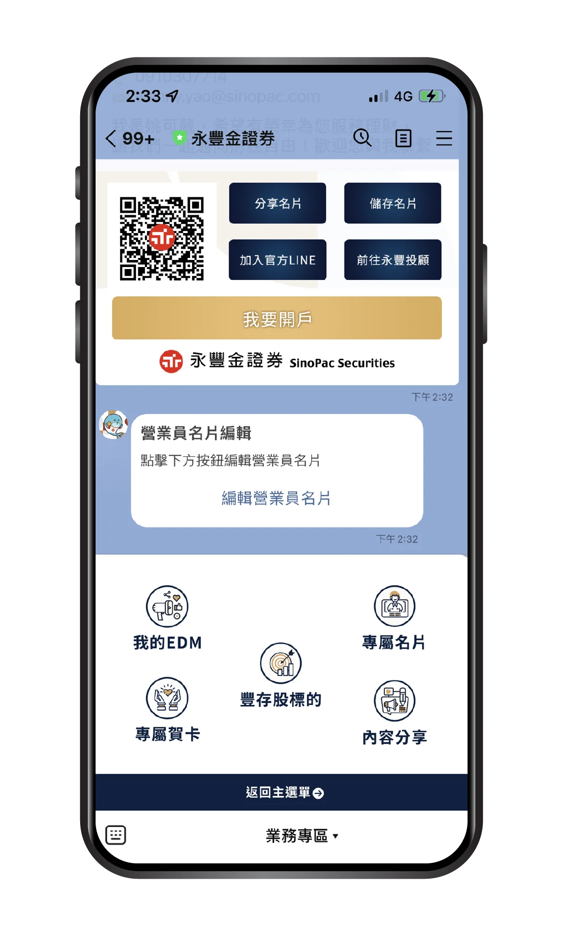 3.LINE 數位名片系統:將業務名片數位化,讓客戶掃描 QR Code 即可加入企業 LINE 官方帳號,並獲取該名業務資訊。
