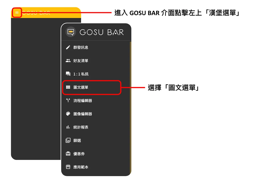 在【 GOSU BAR 的後台】,於漢堡選單處點擊「圖文選單」功能。