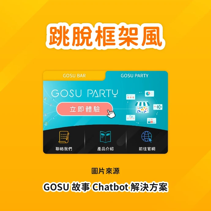 刻意打破傳統的方格結構,直接上傳背景圖片,再依需求於區塊上設定動作選項,創造更多視覺靈活性及空間感,例如:「GOSU 故事 Chatbot 解決方案」,成功深化品牌形象並實現品牌差異化。