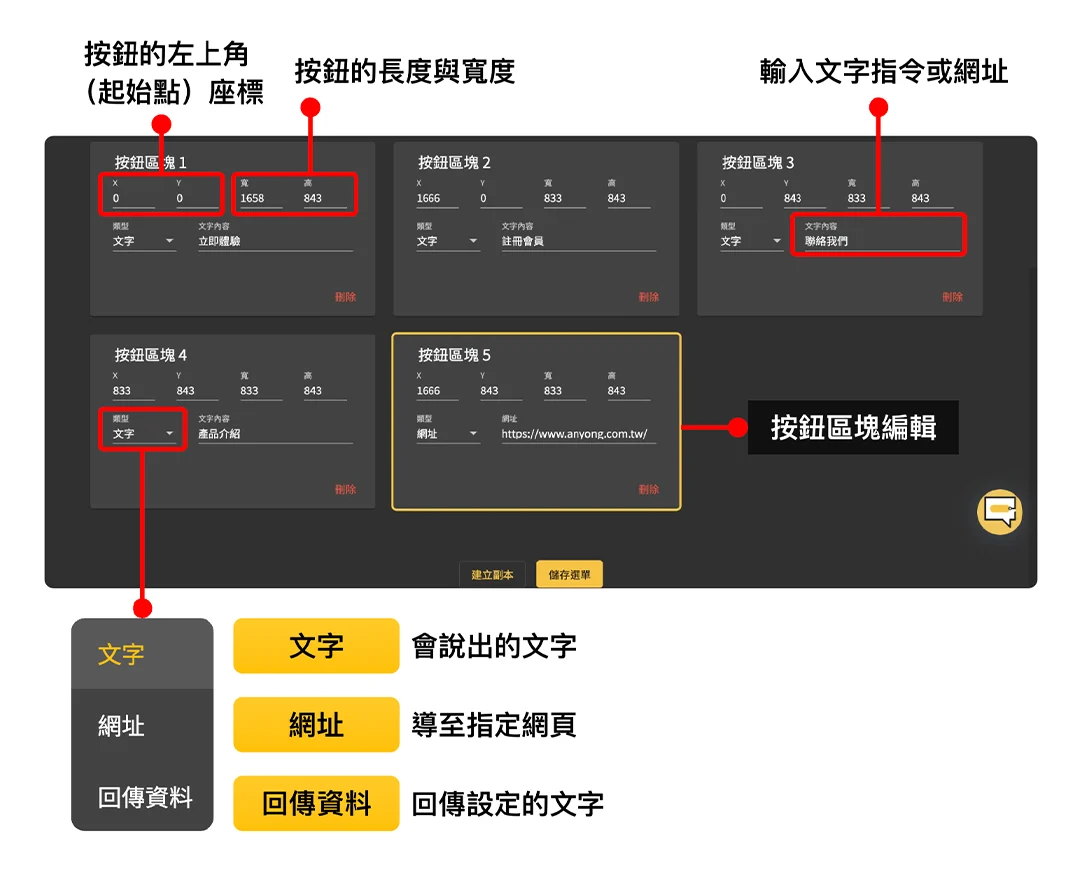 - 設定按鈕的文字、網址和回傳資料,以決定按鈕的觸發動作。