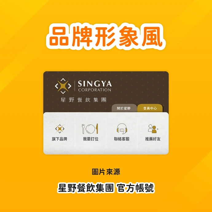 將品牌的代表圖像、標誌及品牌色,作為設計核心,以傳遞企業的專業形象,例如:「星野餐飲集團」,就是運用其 LOGO 和品牌色,加深強化品牌識別度。