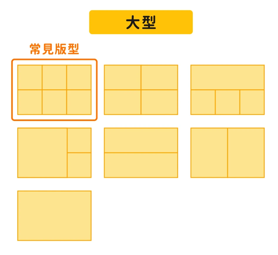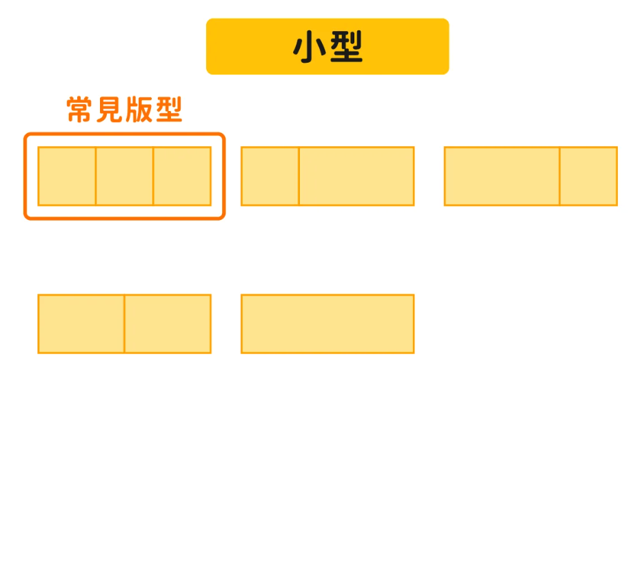 種類 | 7 種 (有 6 格、4 格、3 格、2 格和 1 格的版型) | 5 種 (有 3 格、2 格和 1 格的版型) |
