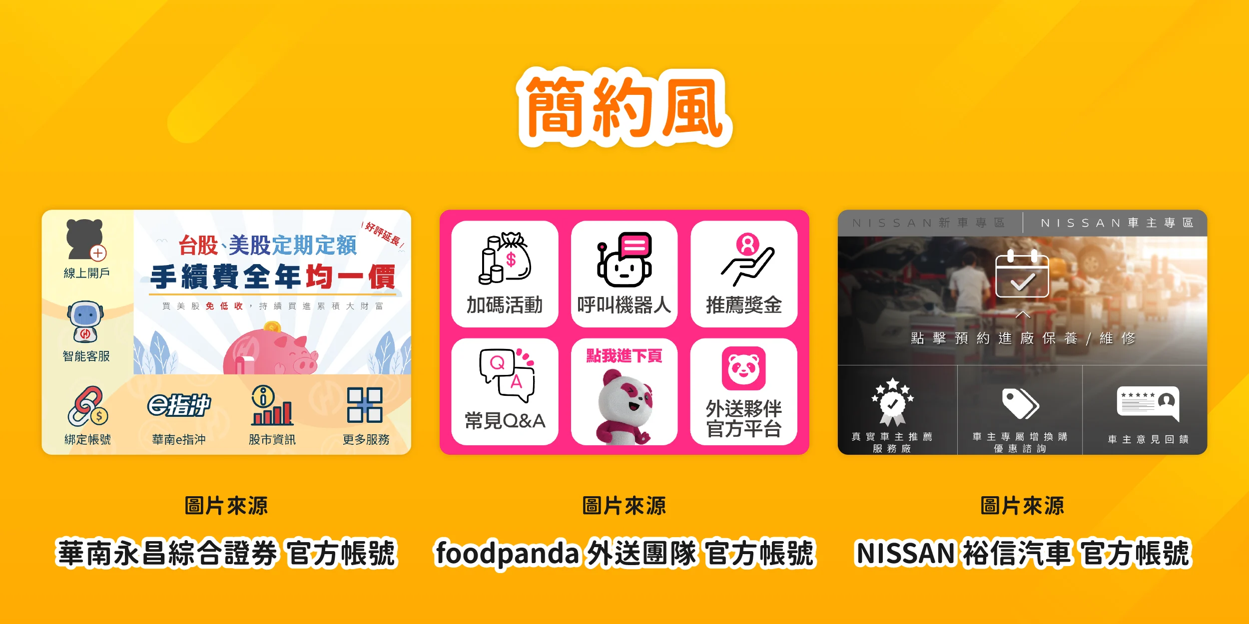 - 以 icon 、色塊與文字設計清晰介面為主,例如:「foodpanda 外送團隊」、「華南永昌綜合證券」和「NISSAN 裕信汽車」,搭配品牌色與吉祥物來呈現企業風格,打造具有辨識度的 LINE 圖文選單介面。