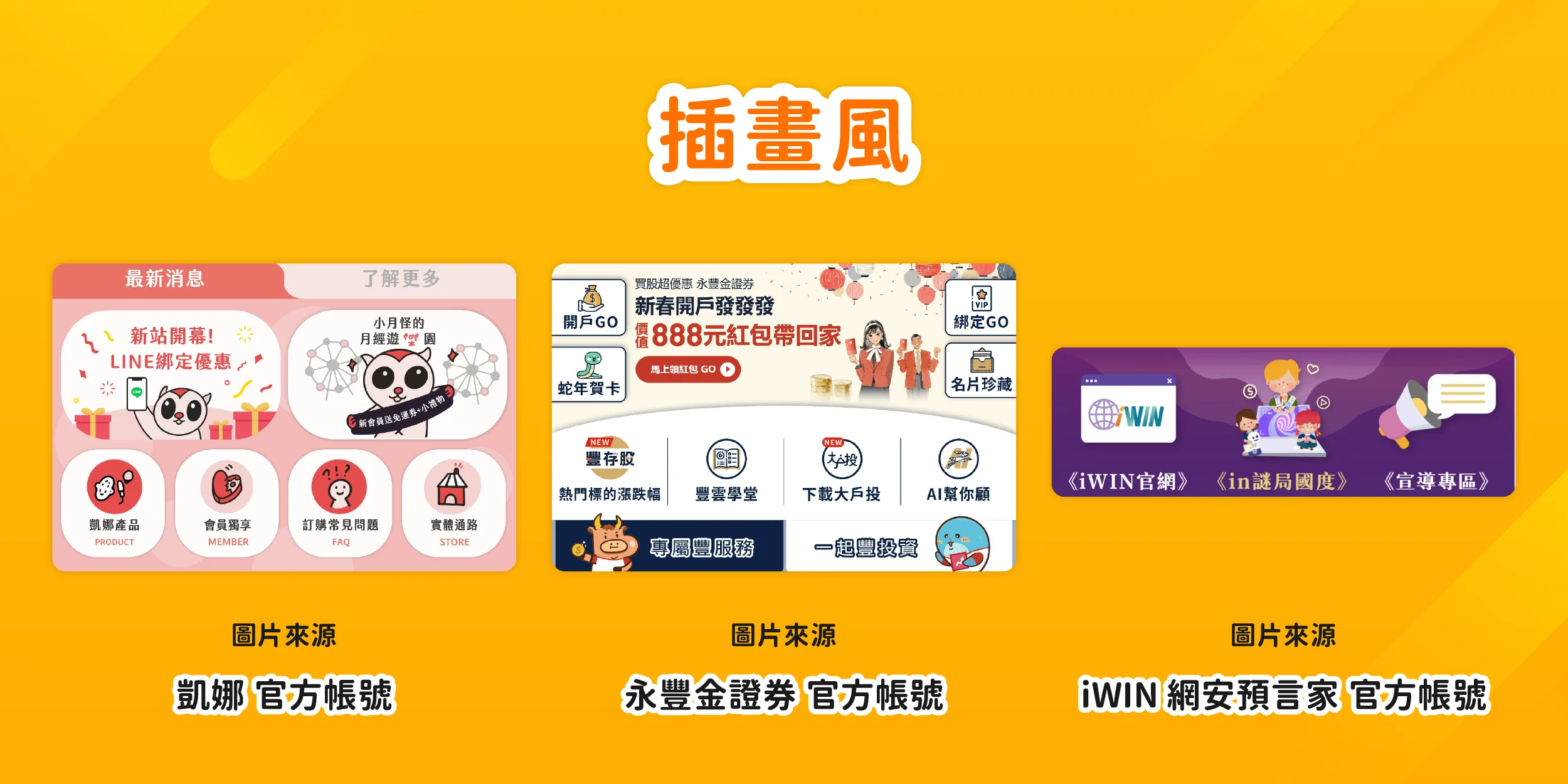 - 將插圖作為視覺焦點,打造親和的品牌形象,例如:「凱娜」使用小月怪插圖,及「永豐金證券」與「iWIN 網安預言家」選用品牌吉祥物插圖,營造輕鬆活潑的互動氛圍。