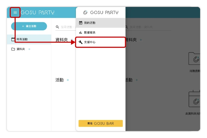 請前往 GOSU PARTY 平台點擊漢堡選單「支援中心」,來解決您的問題。