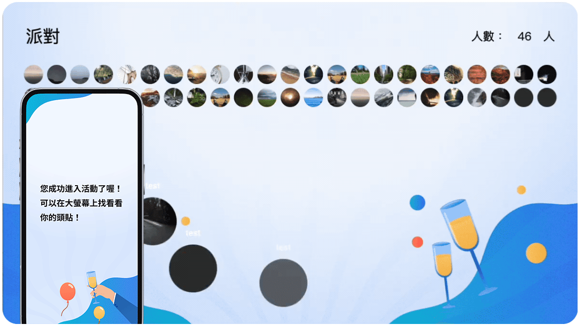 掃描 QRcode 即可完成報到,大螢幕顯示賓客的「頭貼」,增添活動討論度、精緻度