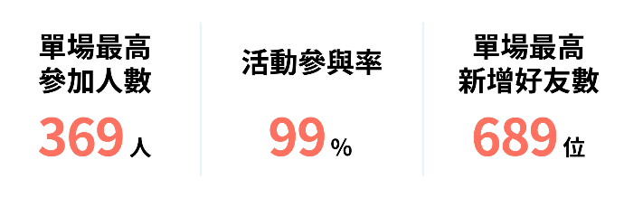 不論活動人數多寡,都能一次把握住潛在客戶,讓品牌成為整場活動的亮點,創造 99% 的超高參與率!