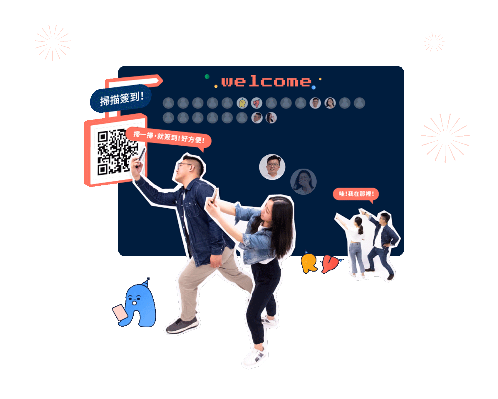 簽到形式改變,透過掃描 QRcode 的方式讓報到環節更流暢,同時提高活動的精緻度,並且將表格上的「名字」轉換成大螢幕上的「頭像」,增添親切感與討論度!